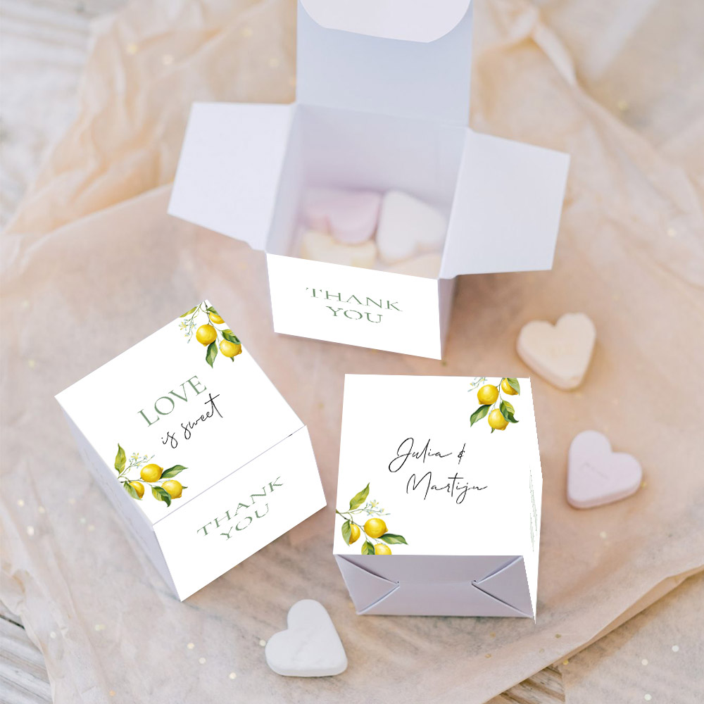Bedankt de gasten van jullie bruiloft met dit doosje in de stijl van jullie trouwkaart! Voeg zelf nog een verrassing of snoepjes toe aan het bedankdoosje. Formaat doosje: 5x5 cm. Deze doosjes mag je zelf nog in elkaar vouwen.