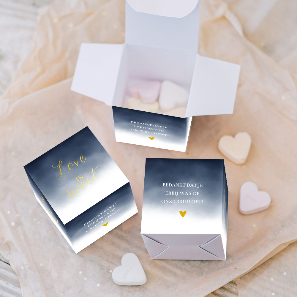 Bedankt de gasten van jullie bruiloft met dit doosje in de stijl van jullie trouwkaart! Voeg zelf nog een verrassing of snoepjes toe aan het bedankdoosje. Formaat doosje: 5x5 cm. Deze doosjes mag je zelf nog in elkaar vouwen.
