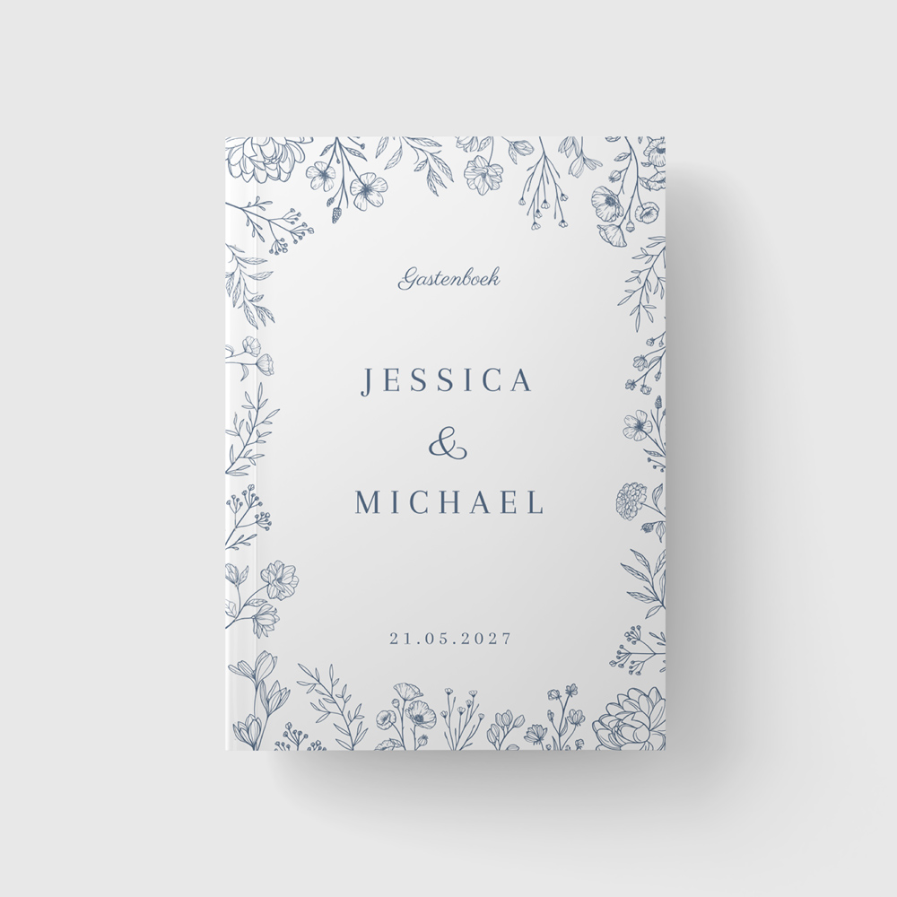Klassiek gastenboek met rand van blauwe bloemen. Dit ontwerp is onderdeel van een trouwhuisstijl, zodat alles voor jullie bruiloft mooi bij elkaar past! Het boek heeft een glanzende harde kaft en kan niet worden bedrukt met folie. Formaat: staand, 72 blanco pagina's om te beschrijven.