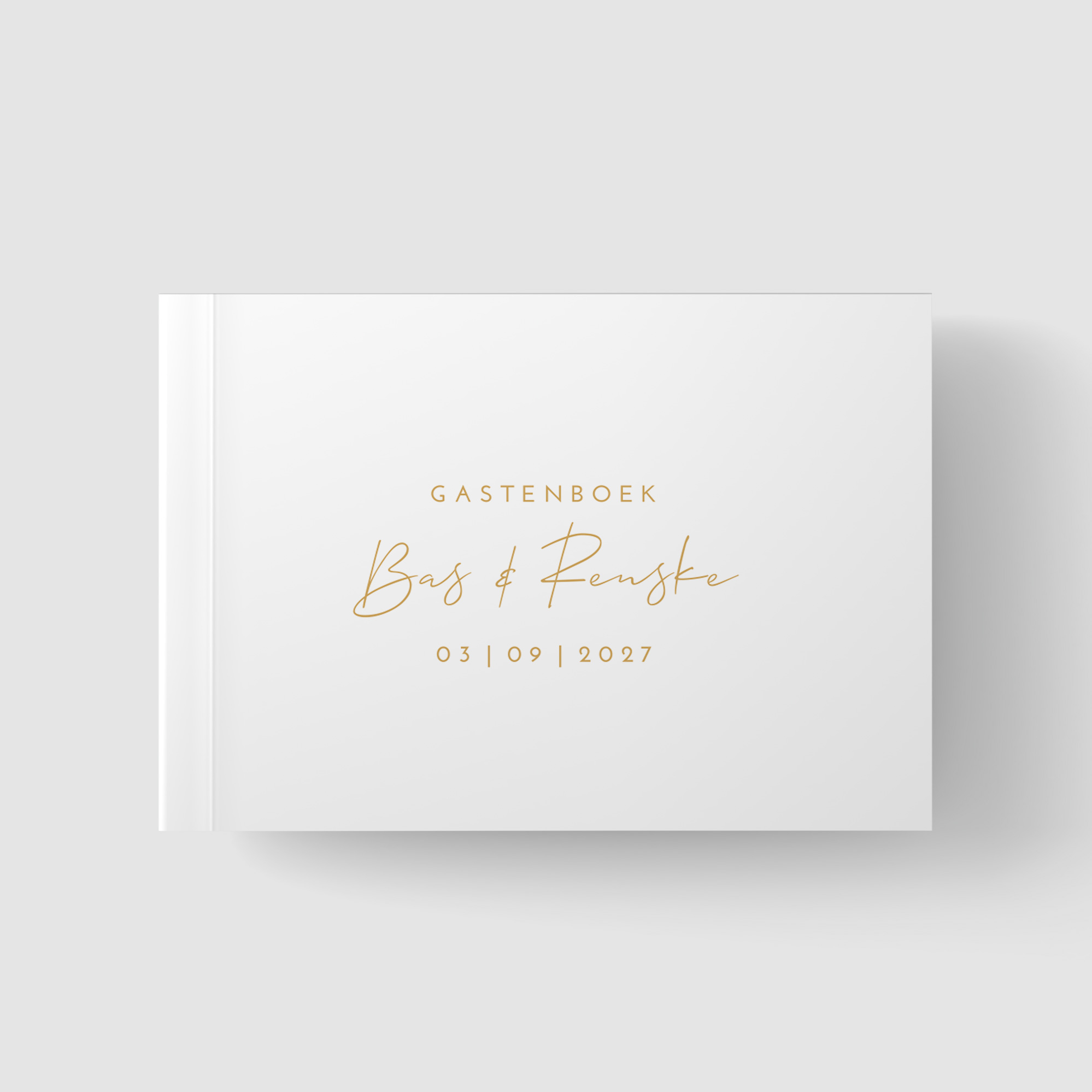 Een romantisch wit gastenboek met sierlijke letters. Je kunt het gastenboek helemaal in de stijl van jullie trouwkaart opmaken in de editor. Het boek heeft een liggend formaat, 72 blanco pagina's en een harde glanzende kaft. De boeken kunnen niet worden bedrukt met folie. Thema: Golden Romance