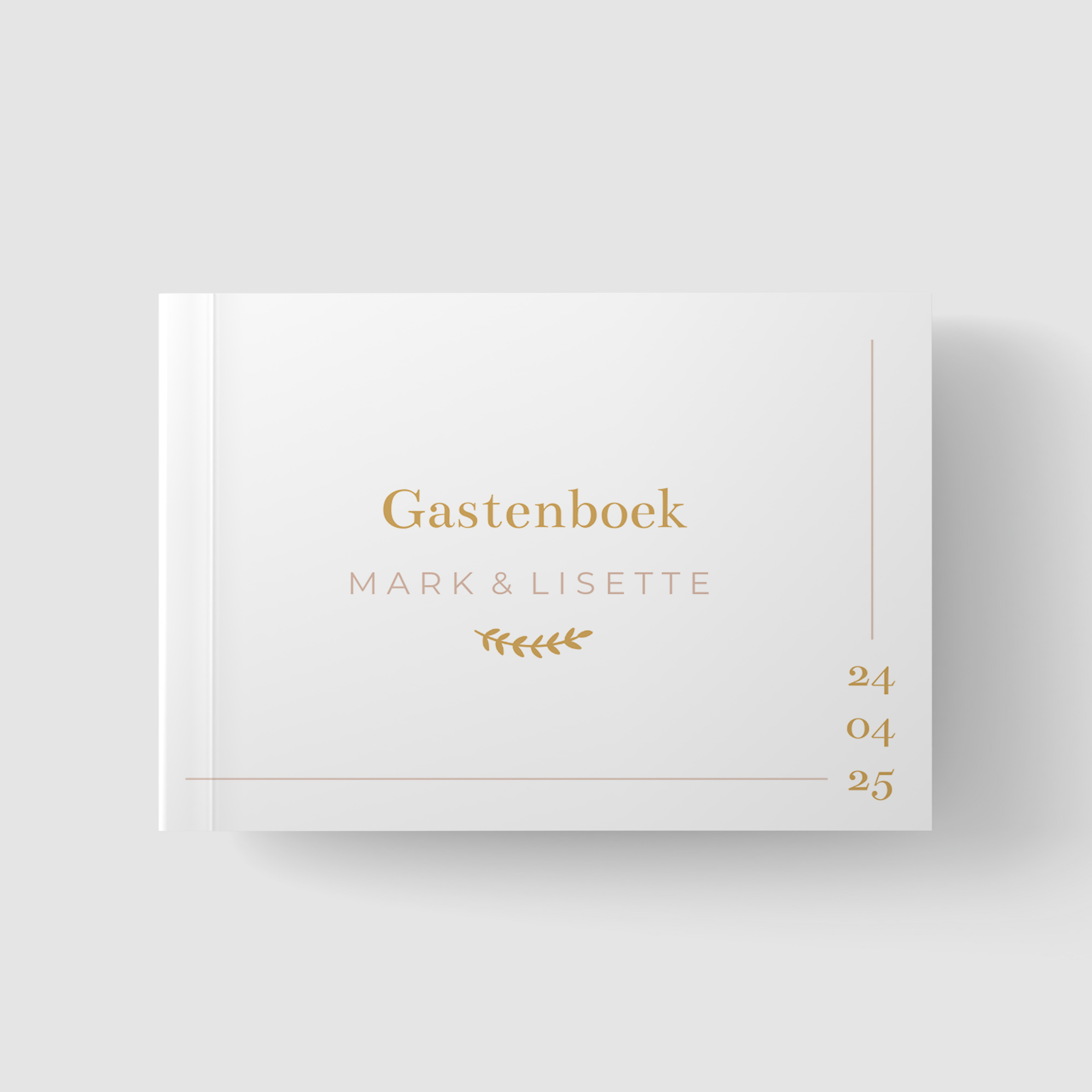 Modern en romantisch gastenboek met roze en goudtinten. Op de achterzijde van het boek staat een trouwlogo met initialen een takje. Pas de cover nog helemaal naar wens aan voor jullie bruiloft. Dit gastenboek heeft een liggend formaat en 72 blanco pagina's aan de binnenzijde waar je op kunt schrijven. De boeken kunnen niet worden bedrukt met folie.