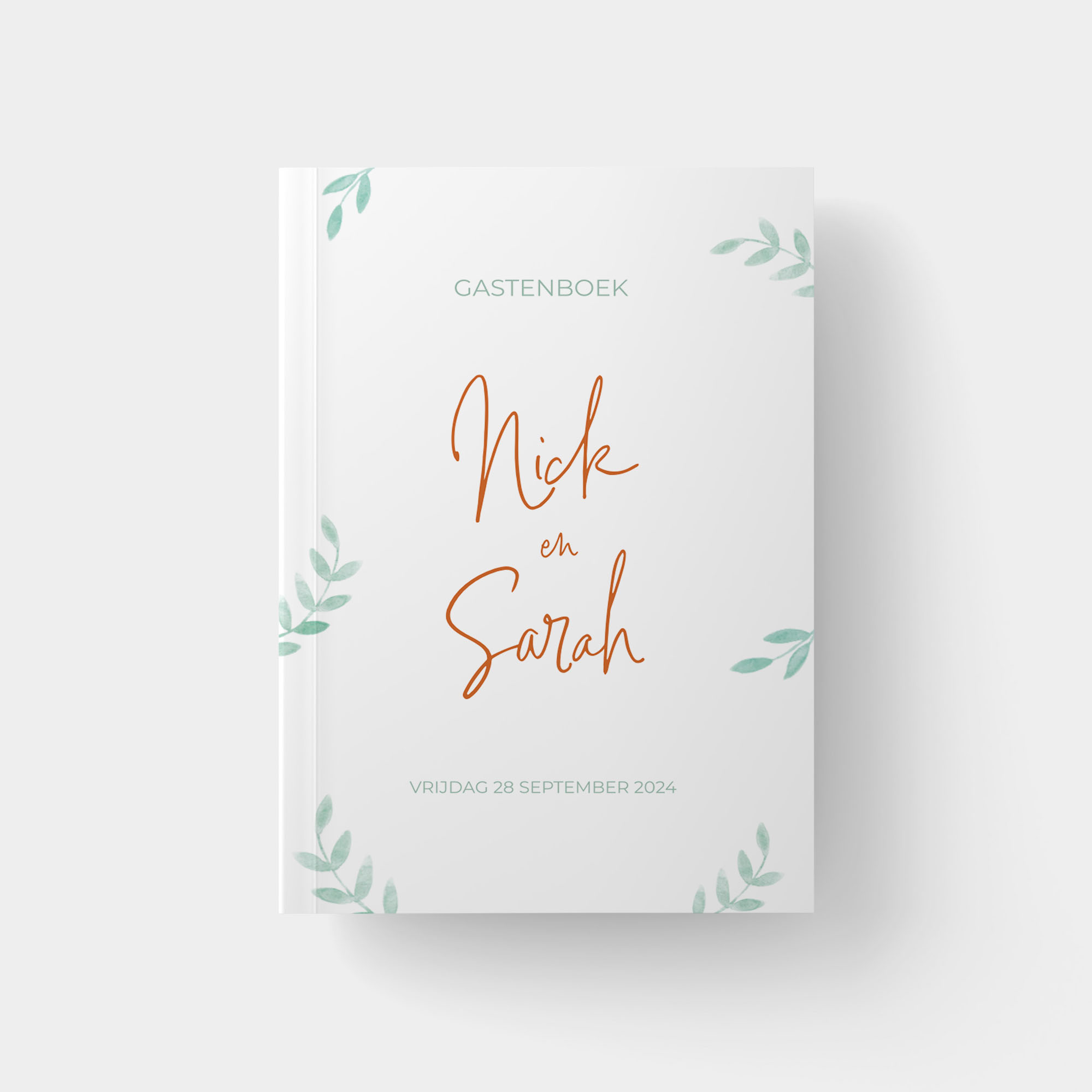 Een gastenboek voor jullie bruiloft in de stijl van de trouwkaart! De omslag van het boek heeft groene watercolor takjes. Super leuk om te bewaren als herinnering. Formaat: staand, 72 blanco pagina's aan de binnenzijde. Het boek heeft een glanzende harde kaft. De boeken kunnen niet worden bedrukt met folie.