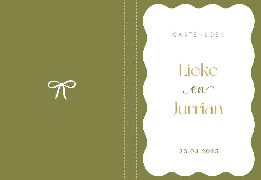 Een groen gastenboek met witte sierlijke achtergrond en letters. Pas de omslag aan naar de stijl van jullie trouwkaart! Formaat: staand, 72 blanco pagina's aan de binnenzijde. Het boek heeft een glanzende harde kaft. Passend bij de trouwhuisstijl Chic Bow.