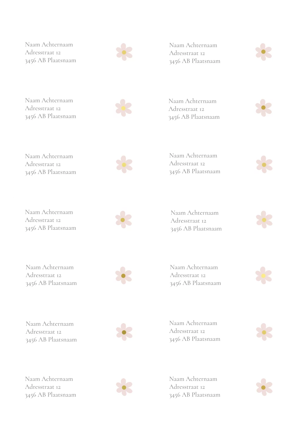 Maak zelf de adresstickers voor op de envelop van jullie geboortekaartje! De adresstickers hebben een formaat van 97x34 mm en zijn afgewerkt met ronde hoeken. Er zitten 14 stuks op een vel. Deze adresstickers hoort bij geboortekaartje Feline.