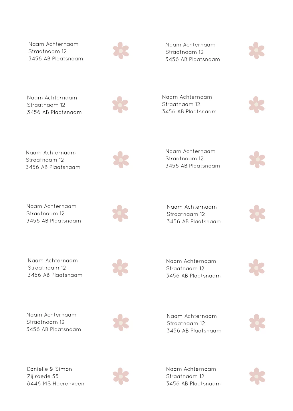 Maak zelf de adresstickers voor op de envelop van jullie geboortekaartje! De adresstickers hebben een formaat van 97x34 mm en zijn afgewerkt met ronde hoeken. Er zitten 14 stuks op een vel. Deze adresstickers hoort bij geboortekaartje Romee.