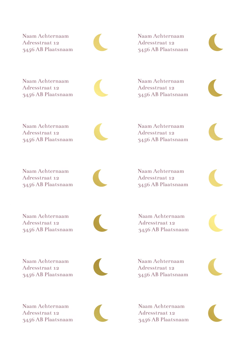 Deze adresstickers met een goudfolie maan zijn bijpassend bij het geboortekaartje Tessa, met een silhouet van een wieg op de kaart. De stickers zijn 97x34 mm en hebben afgeronde hoeken. Per vel 14 stuks.