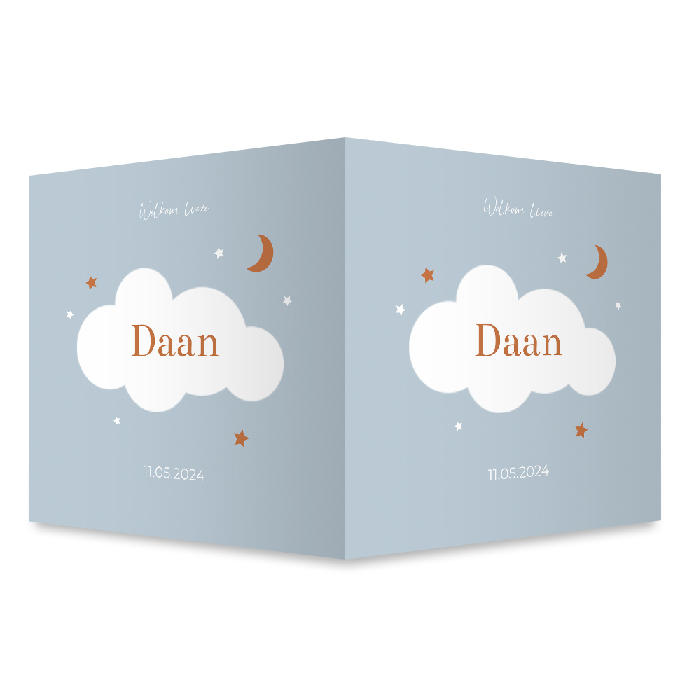 Maak de geboorte van jullie kindje bekend met een geboortebord. Op dit lichtblauwe raambord staan een wolkje met maan en sterren. Je kunt het raambord nog naar wens aanpassen in de editor.