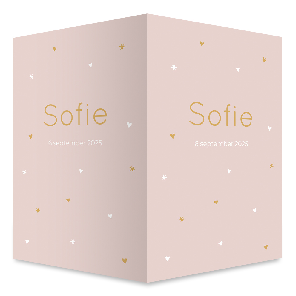 Maak een mooi geboortebord voor aan het raam in de stijl van het geboortekaartje! Zo kondig je de geboorte van jullie meisje op een unieke manier aan. Pas het roze bord met hartjes nog naar wens aan in de editor.
