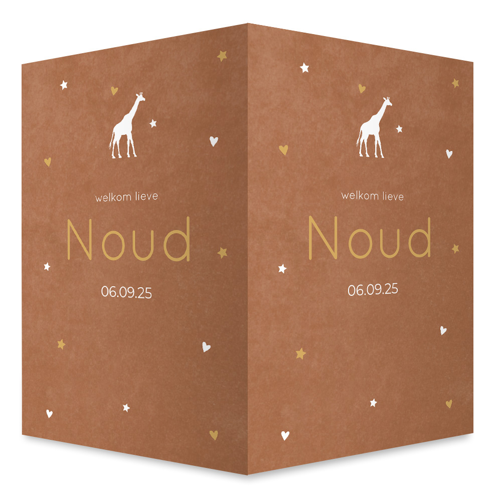 Kondig de geboorte van jullie jongen aan met een geboortebord! Helemaal in de stijl van het geboortekaartje! Het bord heeft een roestkleurige velvet look achtergrond met een giraffe. Bewerk het bord gemakkelijk zelf in de editor.