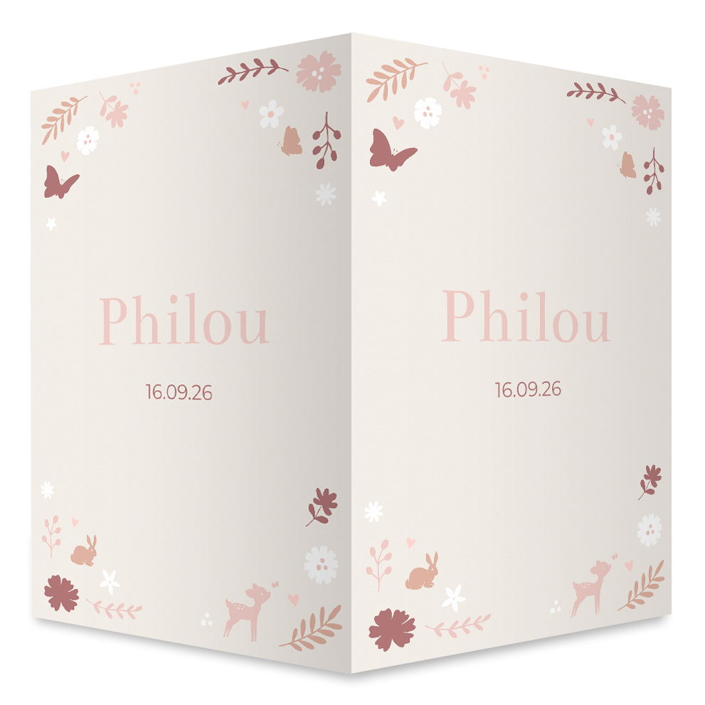 Maak een geboortebord voor aan het raam om de geboorte van jullie meisje mee aan te kondigen. Het raambord heeft een beige achtergrond met een rand van bloemen, vlinders en bosdieren.