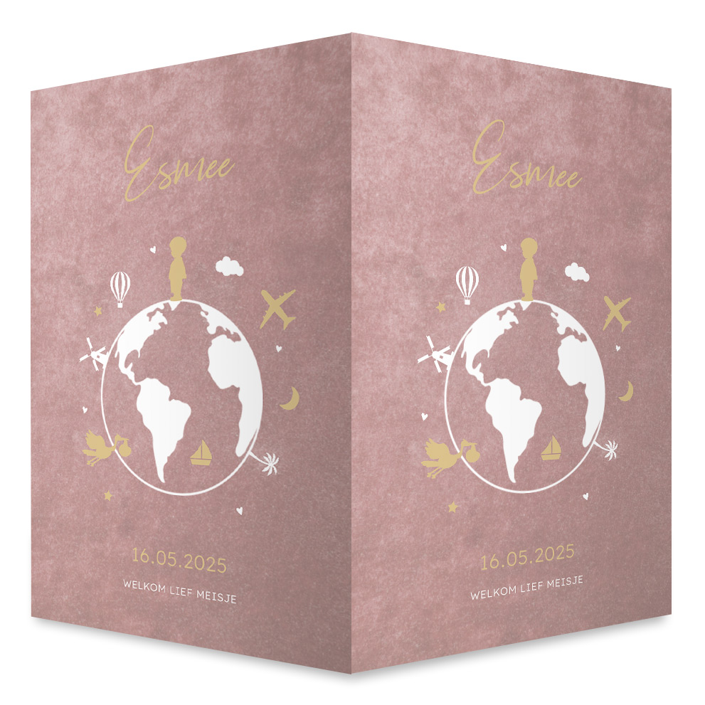 Ontwerp een geboortebord voor aan het raam om de geboorte van jullie meisje mee aan te kondigen. Het raambord heeft een roze velvet look achtergrond met een wereldbol en reisthema.