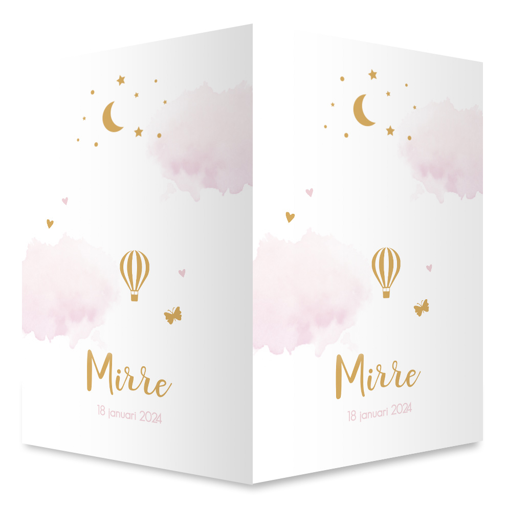 Maak een geboortebord voor aan het raam om de geboorte van jullie meisje mee aan te kondigen. Het raambord heeft een witte achtergrond met roze watercolor wolken en een luchtballon.
