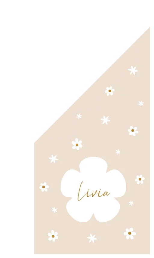 Ontwerp een geboortevlag om de geboorte van jullie dochter aan te kondigen. Deze beige vlag is versierd met witte bloemetjes. Passend bij het geboortekaartje van Livia. Pas de vlag in de editor zelf nog naar wens aan.