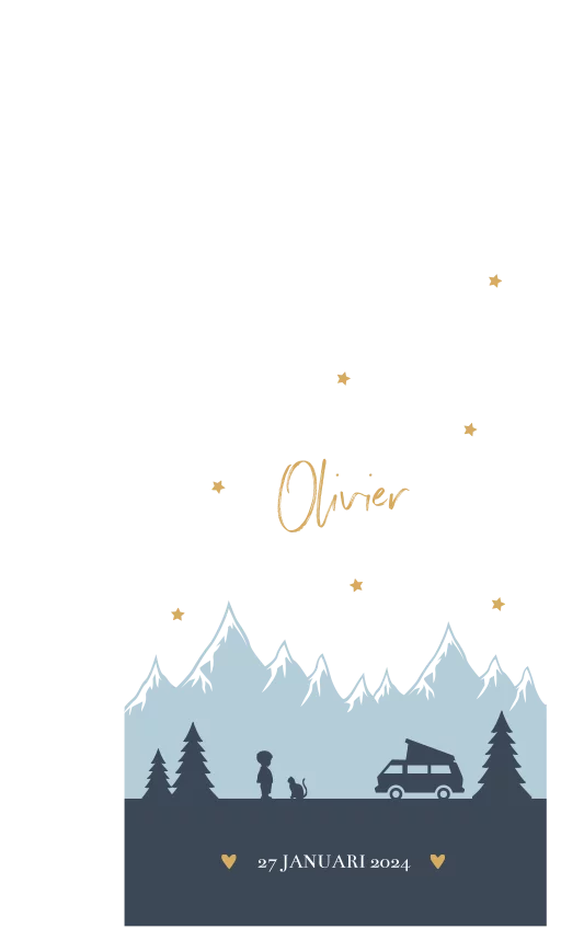 Geboortevlag klein geboortekaartje Olivier blauw bergen camper sterren