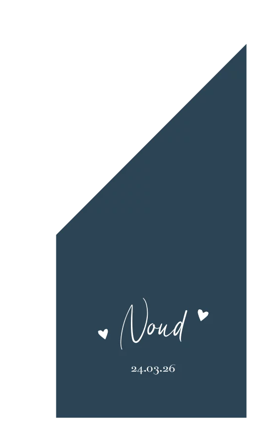 Ontwerp een geboortevlag om de geboorte van jullie zoon aan te kondigen. Deze vlag heeft een donkerblauwe achtergrond en witte hartjes. Passend bij het geboortekaartje van Noud. Pas de vlag in de editor zelf nog naar wens aan.