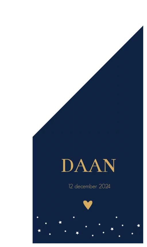 Ontwerp een geboortevlag om de geboorte van jullie zoon aan te kondigen. Op deze blauwe vlag staat een witte sterrenhemel en een gouden hartje. Passend bij het geboortekaartje van Daan. Pas de vlag in de editor zelf nog naar wens aan.