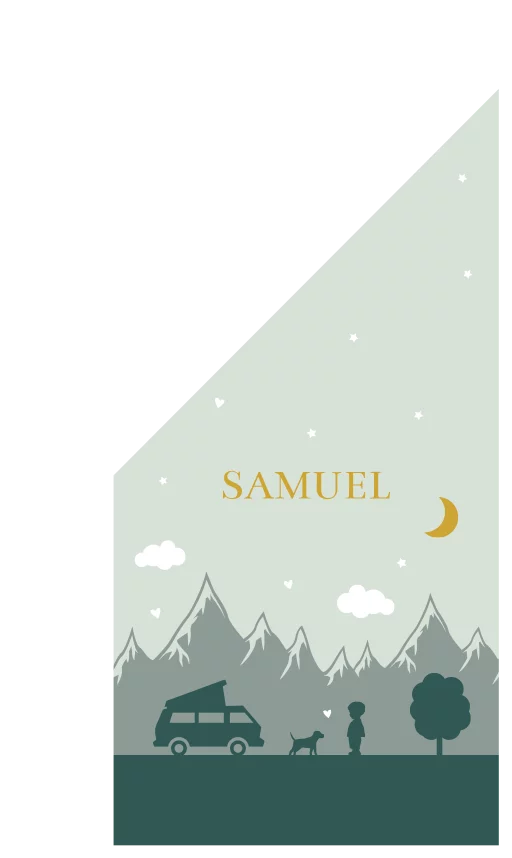 Geboortevlag klein geboortekaartje Samuel groen bergen camper sterren