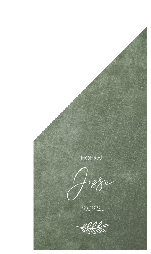 Ontwerp een geboortevlag om de geboorte van jullie zoon aan te kondigen. Deze vlag heeft een groene velvet look achtergrond en een wit takje. Passend bij het geboortekaartje van Jesse. Pas de vlag in de editor zelf nog naar wens aan.