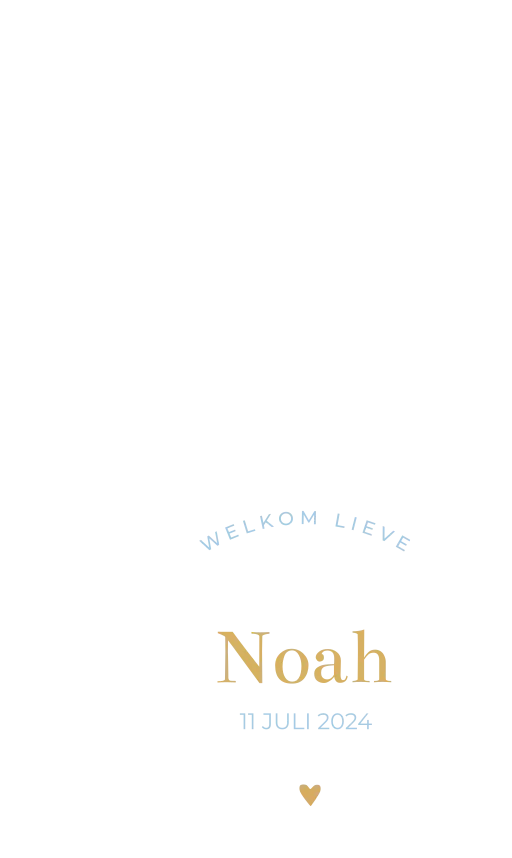 Ontwerp een geboortevlag om de geboorte van jullie zoon aan te kondigen. Deze witte vlag heeft een blauw en goud lettertype en gouden hartje. Passend bij het geboortekaartje van Noah. Pas de vlag in de editor zelf nog naar wens aan.
