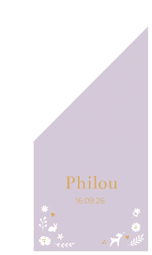 Ontwerp een geboortevlag om de geboorte van jullie dochter aan te kondigen. Deze vlag heeft een lila kleur en witte bloemen en dieren. Passend bij het geboortekaartje van Philou. Pas de vlag in de editor zelf nog naar wens aan.