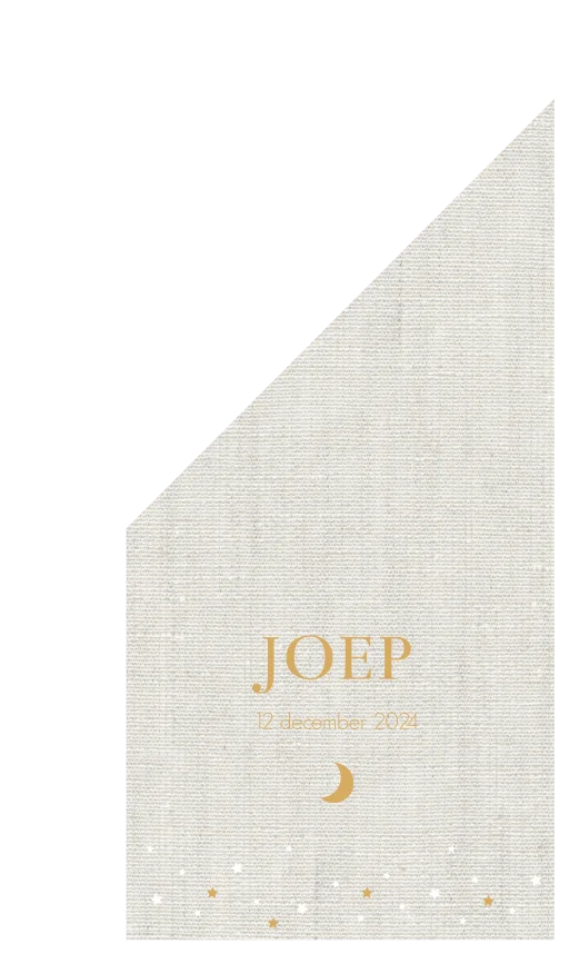 Ontwerp een geboortevlag om de geboorte van jullie zoon aan te kondigen. Deze vlag heeft een linnen look achtergrond en sterren en een maan. Passend bij het geboortekaartje van Joep. Pas de vlag in de editor zelf nog naar wens aan.