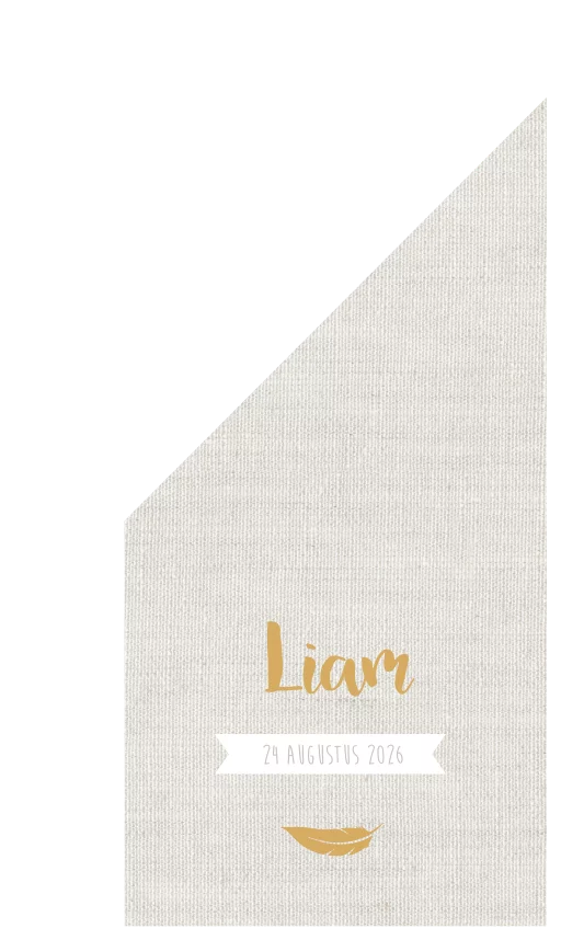 Ontwerp een geboortevlag om de geboorte van jullie zoon aan te kondigen. Deze vlag heeft een linnen look achtergrond en een gouden veertje. Passend bij het geboortekaartje van Liam. Pas de vlag in de editor zelf nog naar wens aan.