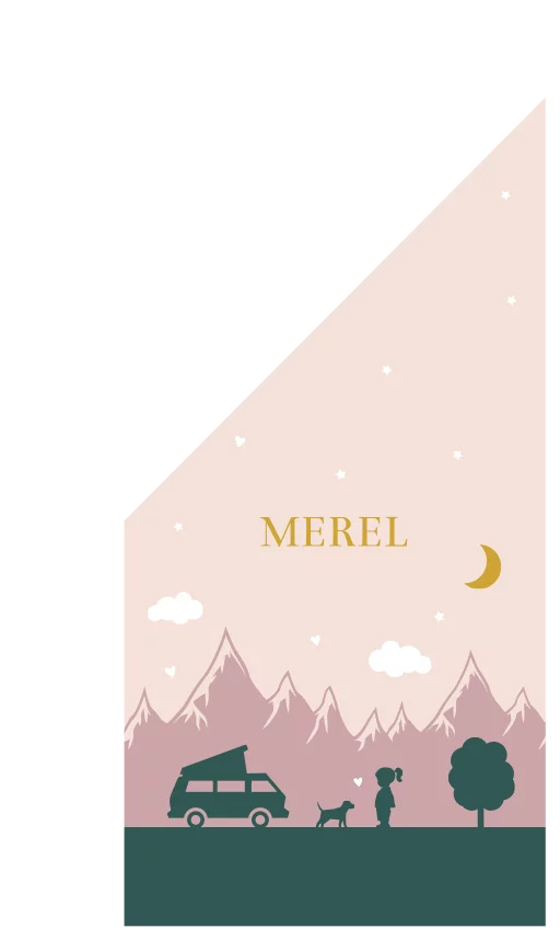 Geboortevlag klein geboortekaartje Merel roze bergen camper sterren