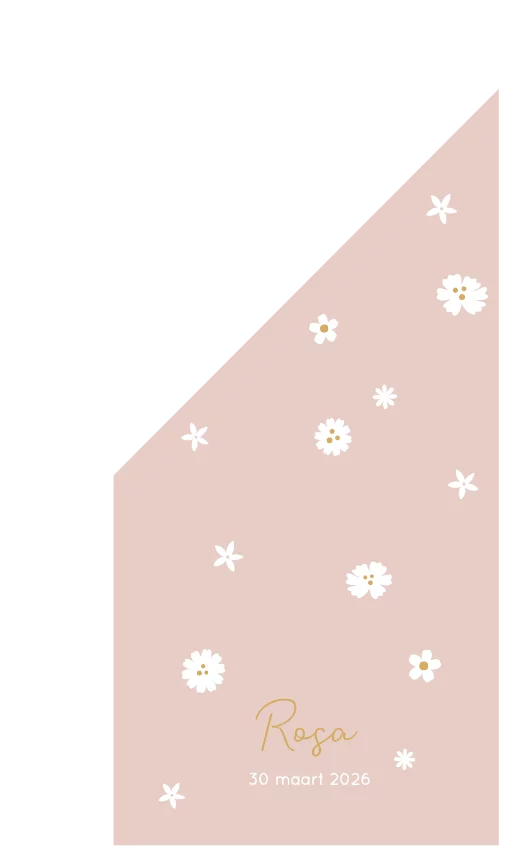 Ontwerp een geboortevlag om de geboorte van jullie dochter aan te kondigen. Deze vlag is lichtroze en heeft verschillende witte bloemen. Passend bij het geboortekaartje van Rosa. Pas de vlag in de editor zelf nog naar wens aan.