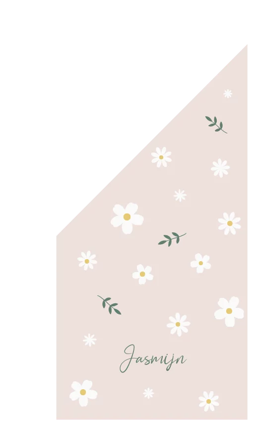 Ontwerp een geboortevlag om de geboorte van jullie dochter aan te kondigen. Deze roze vlag is versierd met bloemen en takjes. Passend bij het geboortekaartje van Jasmijn. Pas de vlag in de editor zelf nog naar wens aan.