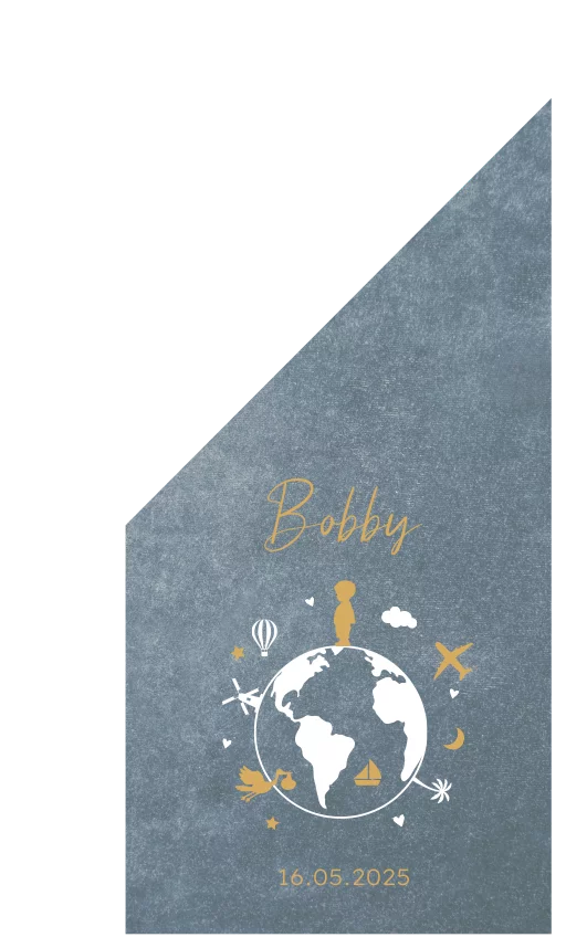 Ontwerp een geboortevlag om de geboorte van jullie zoon aan te kondigen. Deze vlag heeft een blauwe velvet look achtergrond en een wereldbol met een jongen daarop. Passend bij het geboortekaartje van Bobby. Pas de vlag in de editor zelf nog naar wens aan.