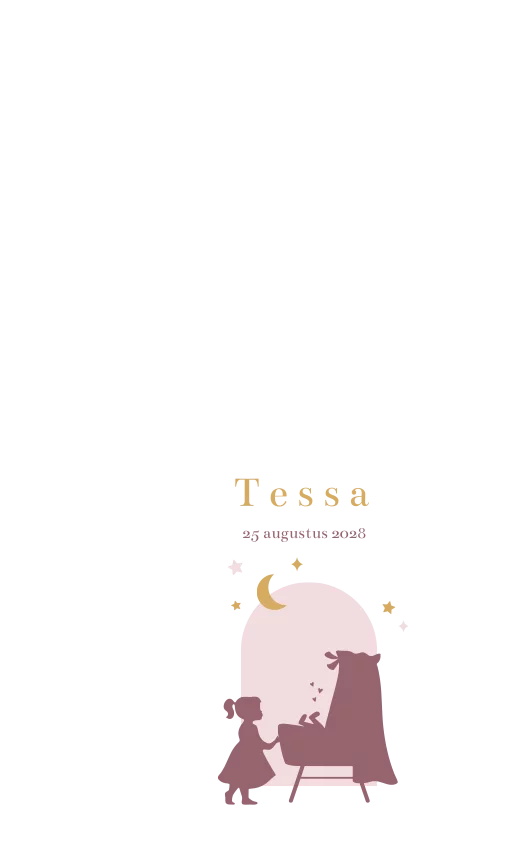 Ontwerp een geboortevlag om de geboorte van jullie dochter aan te kondigen. Op deze vlag staat een silhouet van een meisje bij een wiegje. Passend bij het geboortekaartje van Tessa. Pas de vlag in de editor zelf nog naar wens aan.