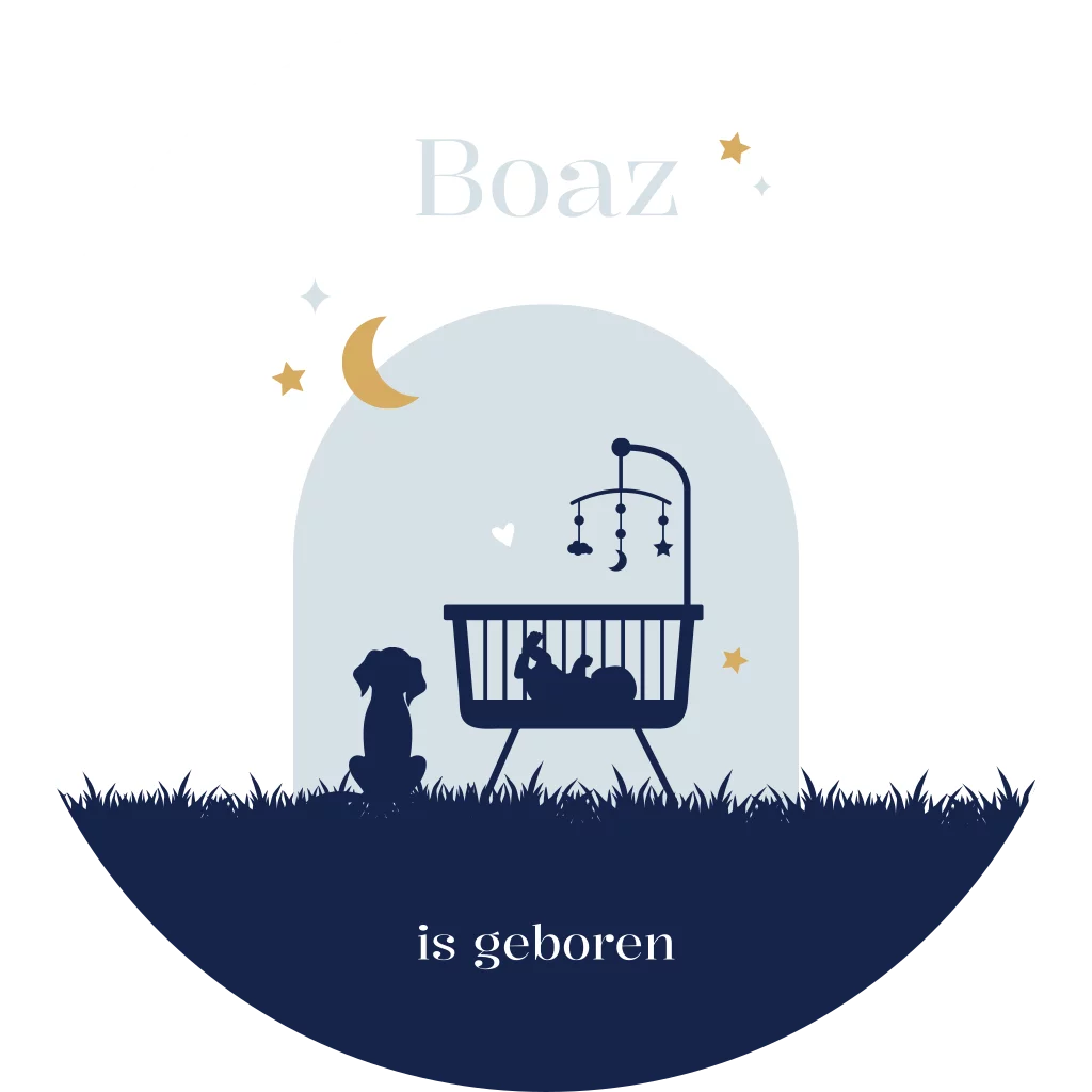 Ontwerp zelf een mooie raamsticker voor op het raam om de geboorte van jullie kindje mee aan te kondigen! Deze ronde sticker heeft een diameter van 60 cm. Passend bij het geboortekaartje van Boaz.