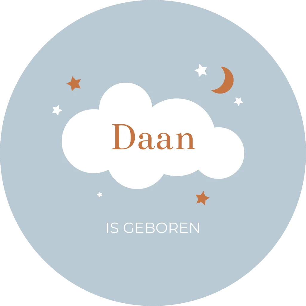 Ontwerp zelf een mooie raamsticker voor op het raam om de geboorte van jullie kindje mee aan te kondigen! Deze ronde sticker heeft een diameter van 60 cm. Passend bij het geboortekaartje van Daan.