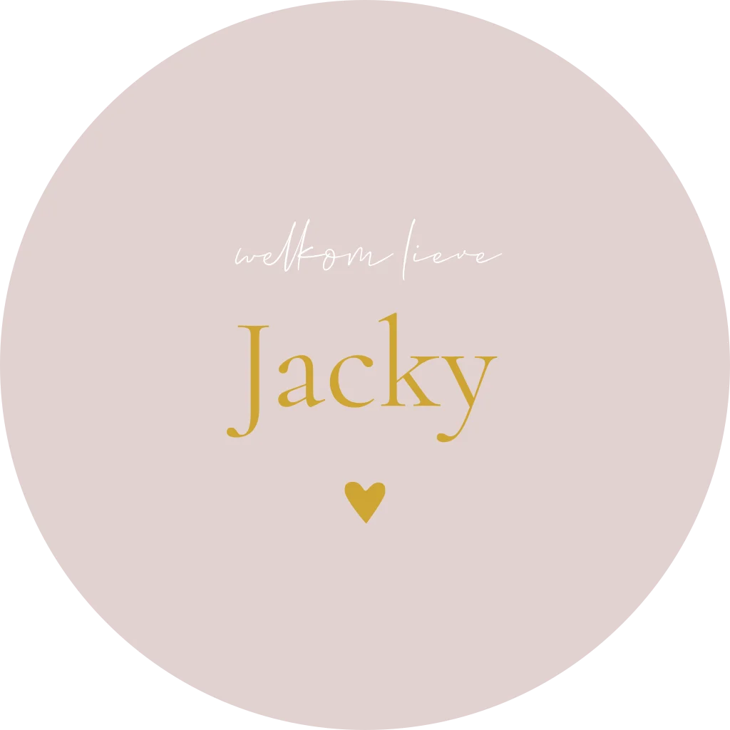Ontwerp zelf een mooie raamsticker voor op het raam om de geboorte van jullie kindje mee aan te kondigen! Deze ronde sticker heeft een diameter van 60 cm. Passend bij het geboortekaartje van Jacky.