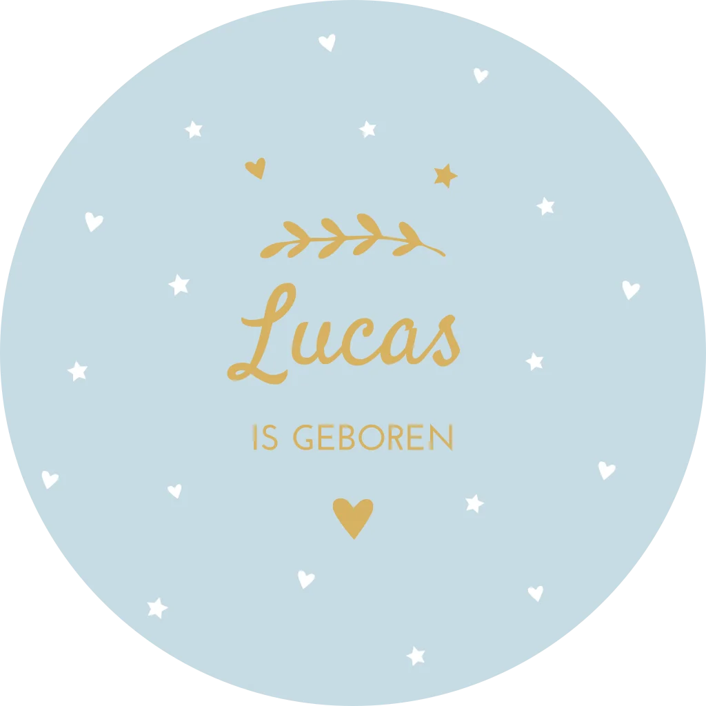 Ontwerp zelf een mooie raamsticker voor op het raam om de geboorte van jullie kindje mee aan te kondigen! Deze ronde sticker heeft een diameter van 60 cm. Passend bij het geboortekaartje van Lucas.
