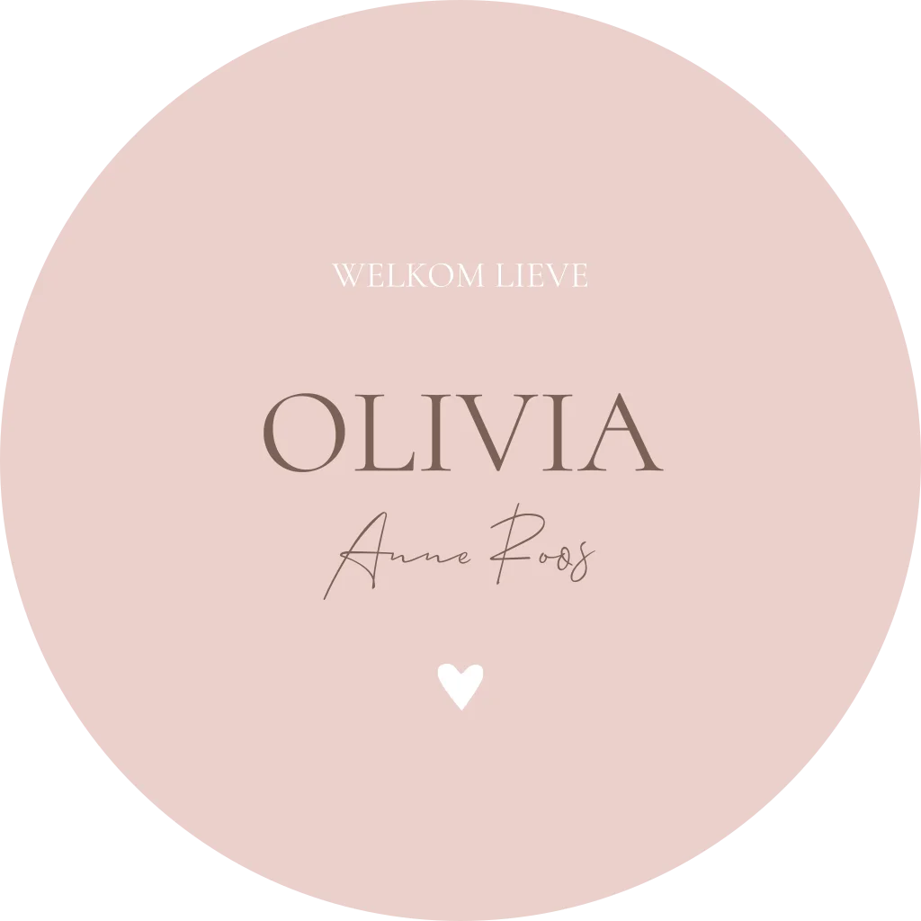 Ontwerp zelf een mooie raamsticker voor op het raam om de geboorte van jullie kindje mee aan te kondigen! Deze ronde sticker heeft een diameter van 60 cm. Passend bij het geboortekaartje van Olivia.