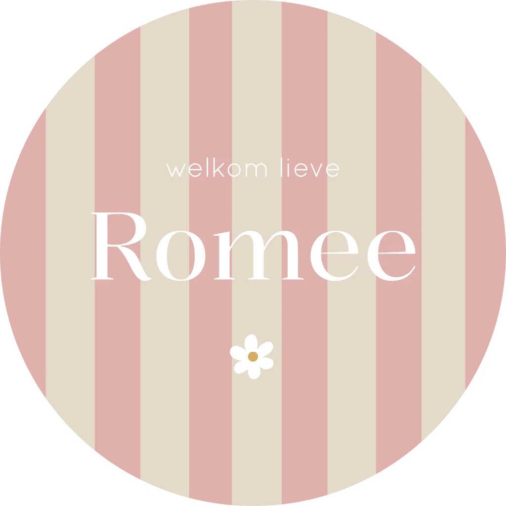 Ontwerp zelf een mooie raamsticker voor op het raam om de geboorte van jullie kindje mee aan te kondigen! Deze ronde sticker heeft een diameter van 60 cm. Passend bij het geboortekaartje van Romee.
