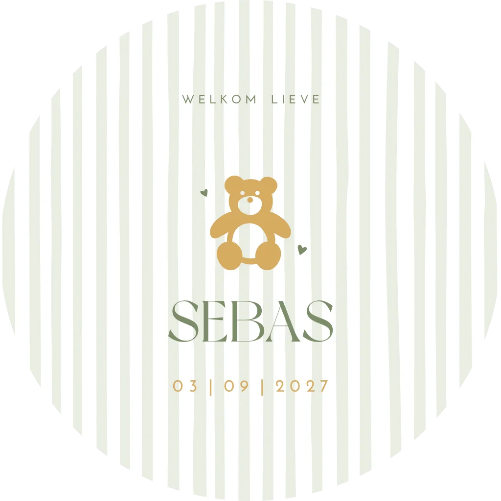 Ontwerp zelf een mooie raamsticker voor op het raam om de geboorte van jullie kindje mee aan te kondigen! Deze ronde sticker heeft een diameter van 60 cm. Passend bij het geboortekaartje van Sebas.