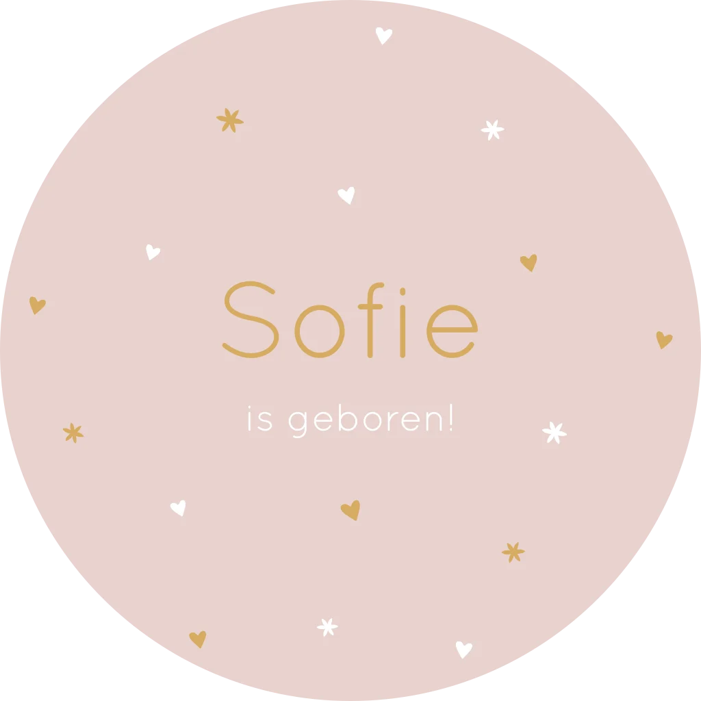 Ontwerp zelf een mooie raamsticker voor op het raam om de geboorte van jullie kindje mee aan te kondigen! Deze ronde sticker heeft een diameter van 60 cm. Passend bij het geboortekaartje van Sofie.