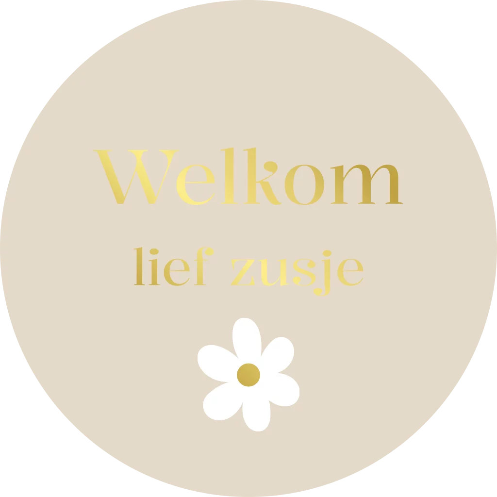 Ontwerp je eigen sluitsticker voor op de envelop in de stijl van het geboortekaartje! Deze beige sticker heeft een wit bloemetje en is afgewerkt met goudfolie. Pas de kleuren van de sticker zelf naar wens aan.