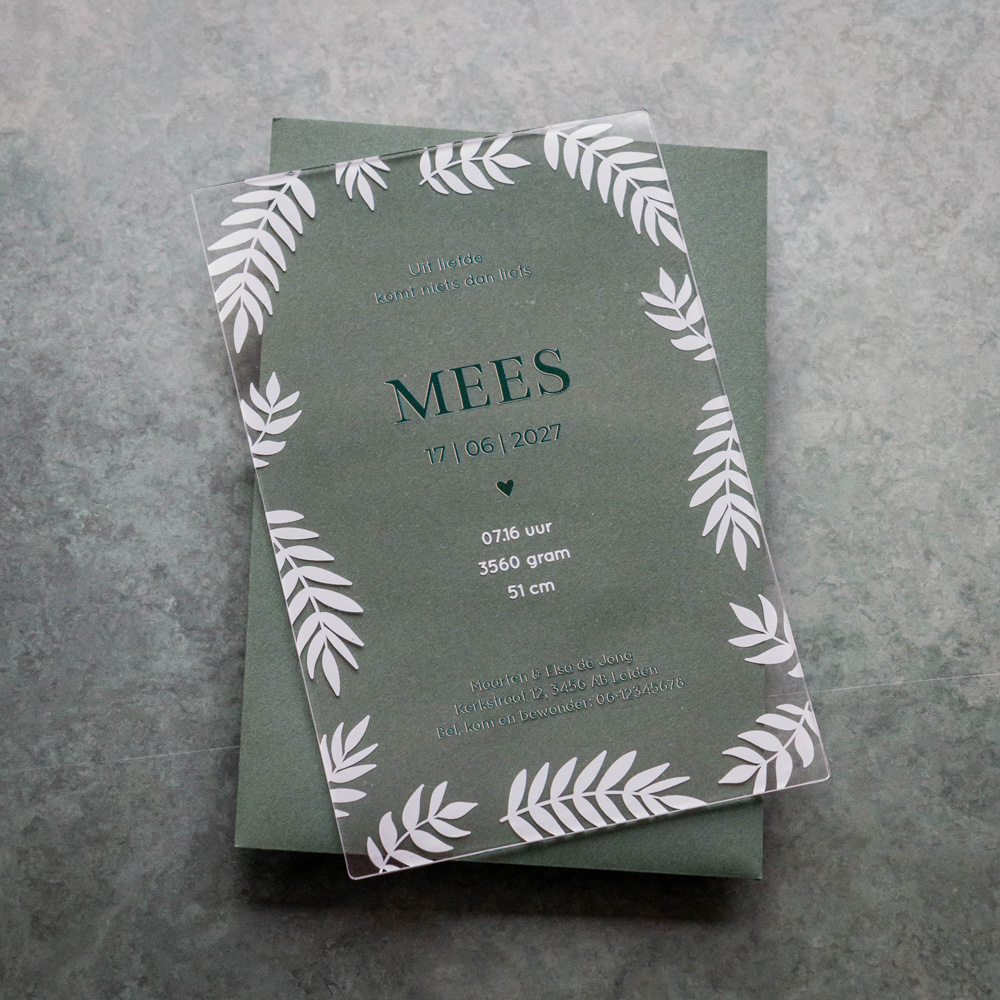 Een botanisch geboortekaartje gedrukt op luxe en stevig acryl/plexiglas. Dit geboortkaartje heeft een rand van witte bladeren en groene tekst. Pas de kleuren nog naar wens aan!