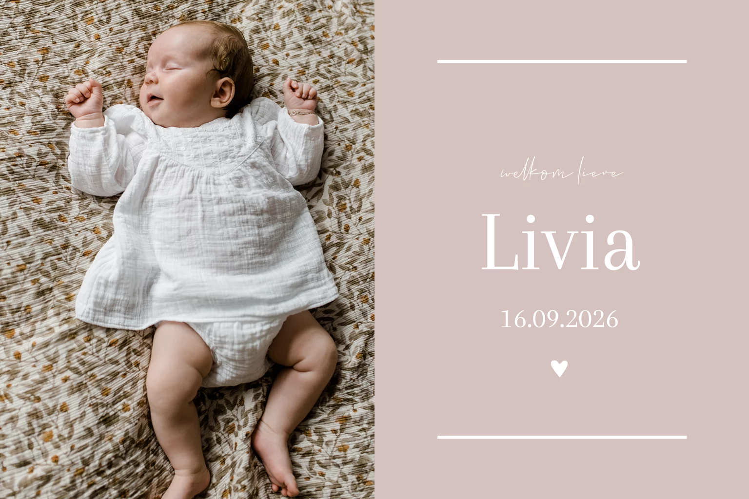 Modern geboortekaartje met een foto en goudfolie voor een meisje. Het kaartje heeft een oudroze achtergrond en kleine hartjes. Aan de voorzijde en binnenzijde kun je een foto toevoegen van jullie kindje. Fotografie: Anouk Wubs - www.anoukwubs.nl