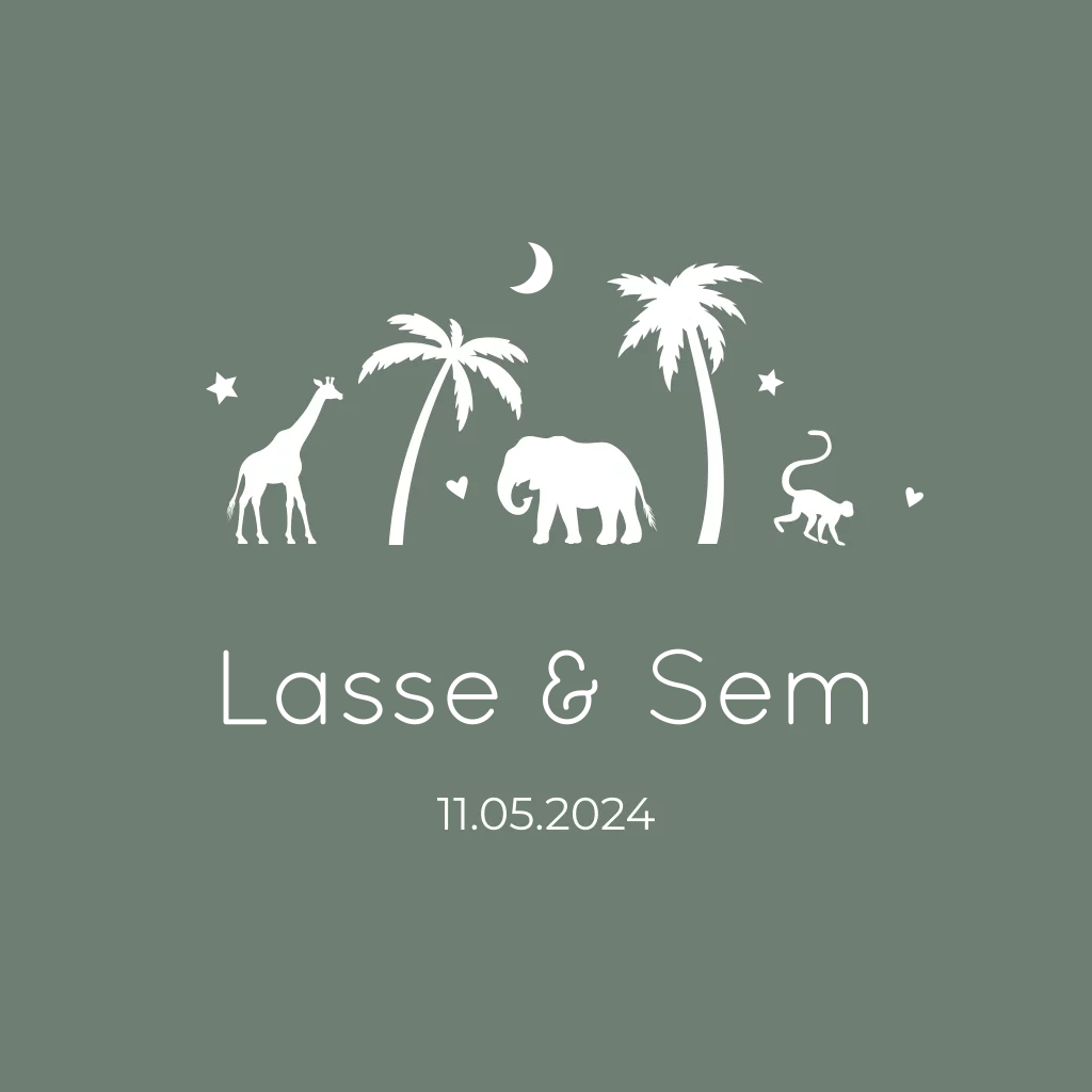 Tweeling geboortekaartje met jungle thema: een giraffe, olifant, aap en palmbomen. De kaart heeft een groene kleur en heeft elementen in goudfolie. Je kunt de kleur van de kaart nog naar wens aanpassen.
