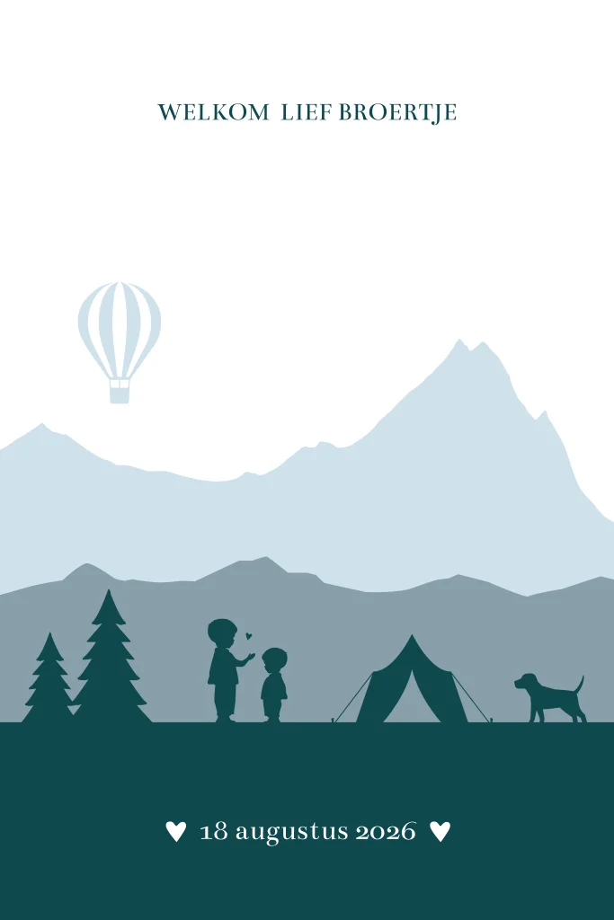 Een geboortekaartje vol met avontuur! Voor als jullie van reizen en kamperen houden. Op het kaartje staan bergen, een tent, luchtballon, een hond en twee broertjes, maar je kunt de silhouetten zelf nog naar wens aanpassen. In de beeldbank kun je allemaal plaatjes vinden die je kunt toevoegen: zo maak je er een heel persoonlijk geboortekaartje van!