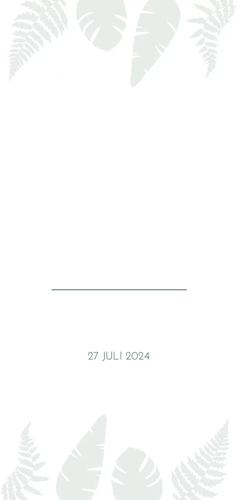 Een botanisch geboortekaartje met een rand van bladeren, de eerste letter en de naam in goudfolie. Pas de kleuren van de kaart en de folie naar wens aan.