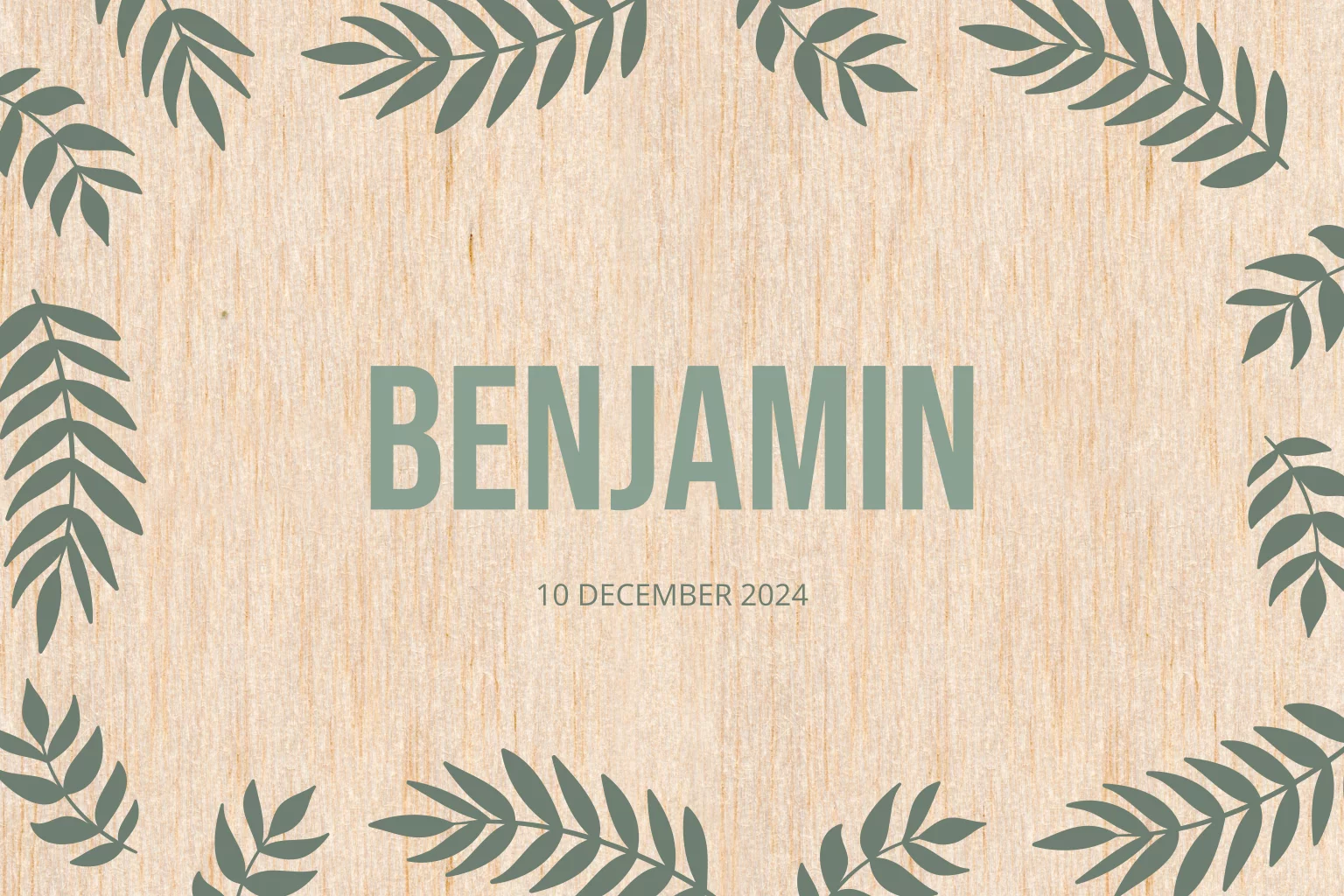 Geboortekaartje voor een jongen op hout! Dit unieke geboortekaartje heeft een rand van groene blaadjes. Het kaartje past daardoor helemaal bij de botanische trend. Je past zelf de kleur van de kaart naar smaak aan.