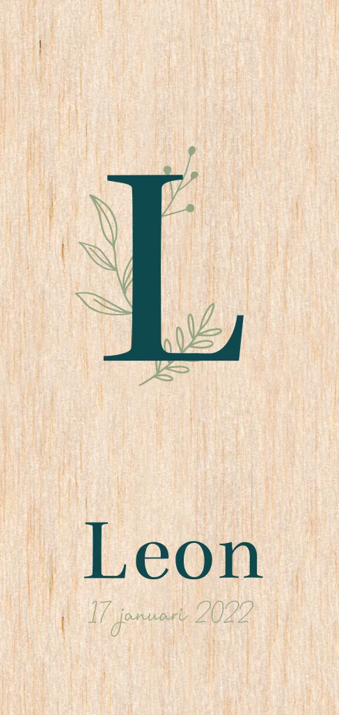 Een uniek geboortekaartje van hout! Dit kaartje past helemaal in de botanische trend. De eerste letter van de naam versierd met getekende takjes en blaadjes. Vul de letter van jullie kindje in en rangschik de blaadjes mooi om de letter heen.