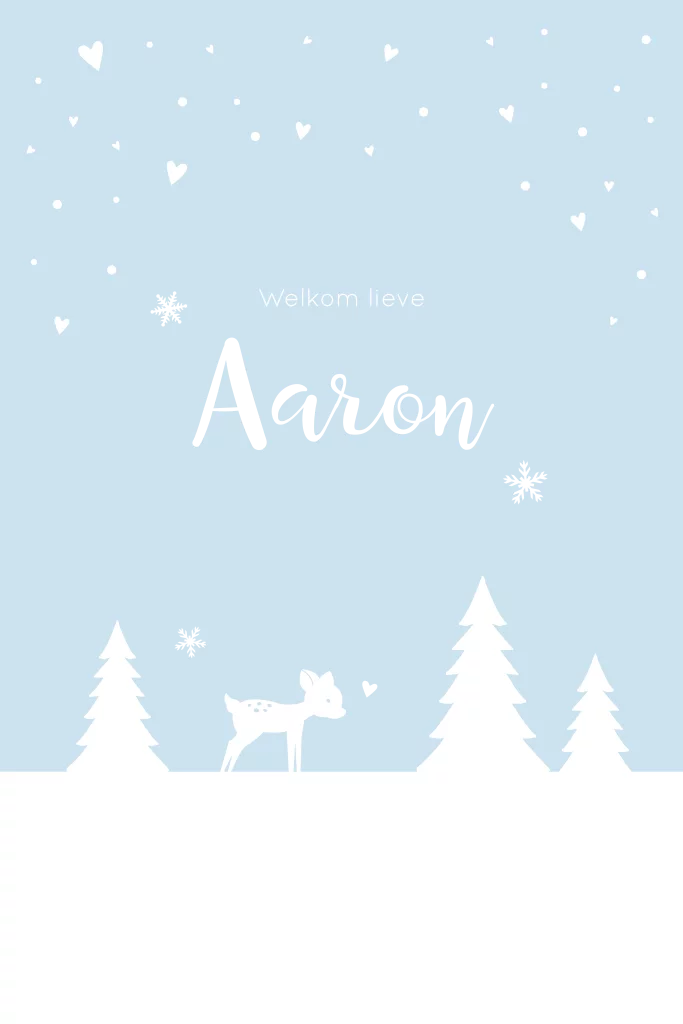 Een winters geboortekaartje met sneeuw, hartjes, een hertje en zilverfolie. Pas de kleur van de kaart en de folie naar wens aan.