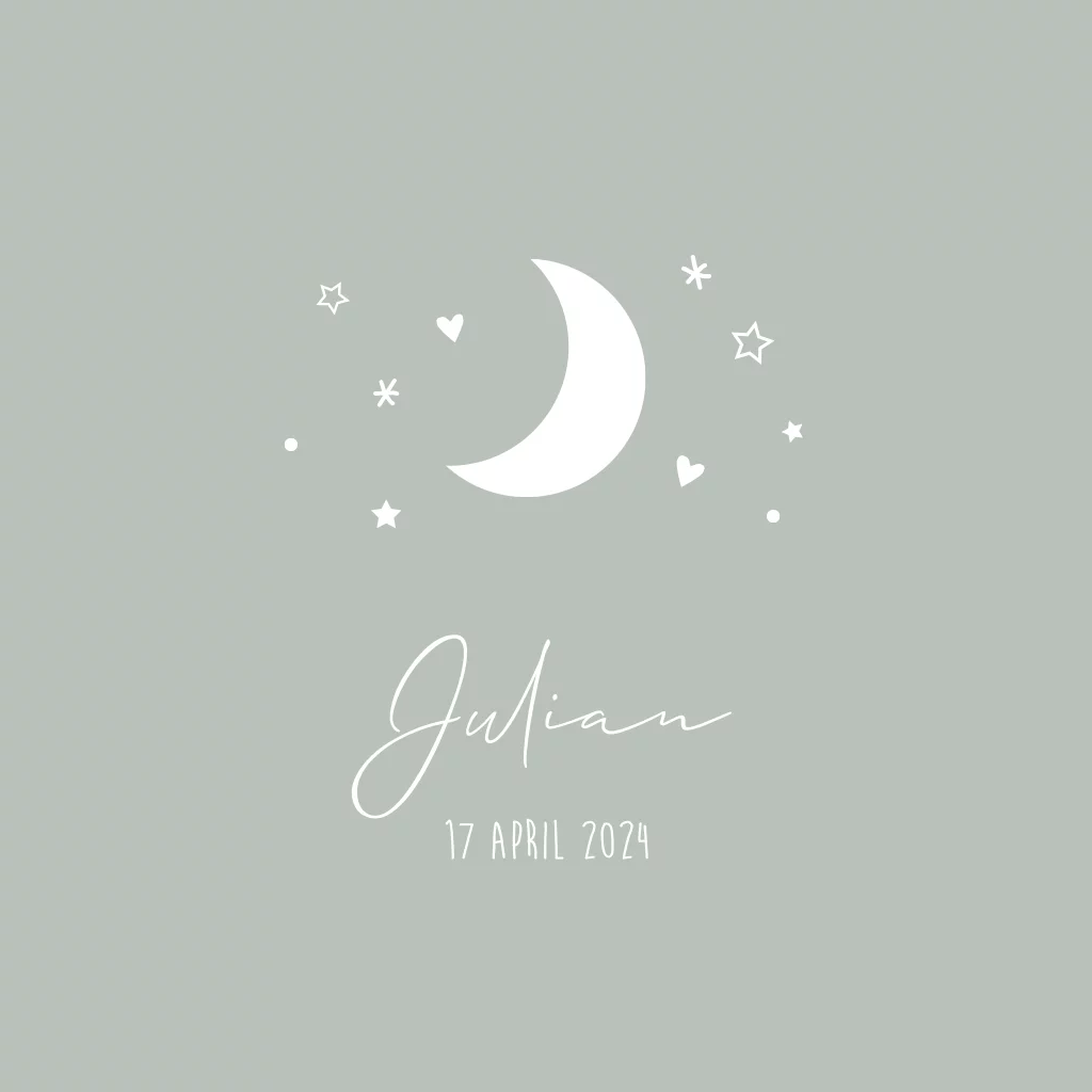 Lief dubbel gevouwen geboortekaartje in een grijs groene kleur met maan en sterren. Pas de kleur van de kaart naar wens aan. Het kaartje heeft ronde hoeken.
