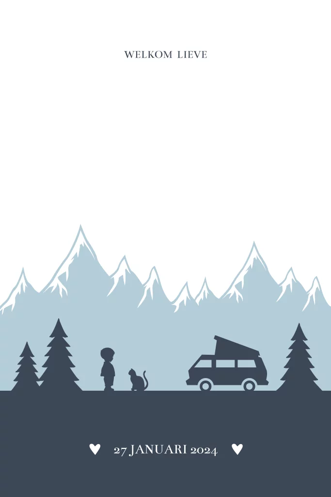 Geboortekaartje voor jongens met bergen, silhouetten van een camper, een kat en jongetje. Echt iets voor kampeerliefhebbers. Pas de kaart in de editor aan.
